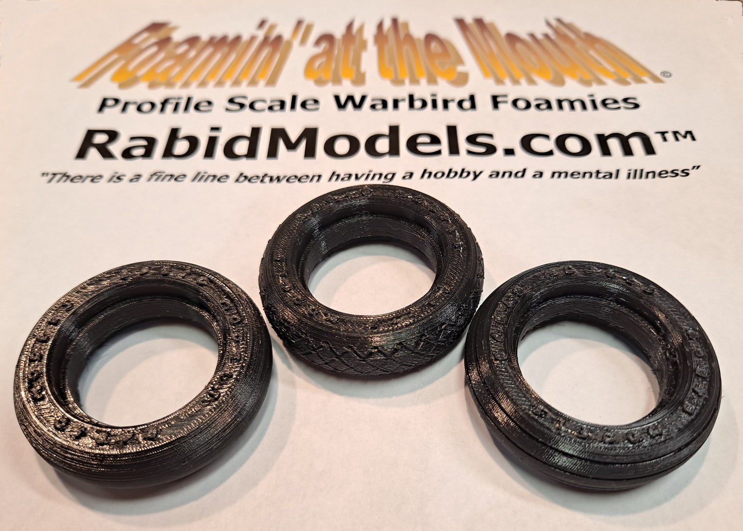 SCALE TIRES: black flexible TPU with optional tread detail. Main wheel is 1.75" diameter, 1/2" wide. One complete main wheel & hub set weighs about 10gm (varies depending on your choice of hubs). The P-63 nose wheel is 1.25" in diameter and about 1/4" wide and one complete nose wheel & hub weighs 3.5gm.