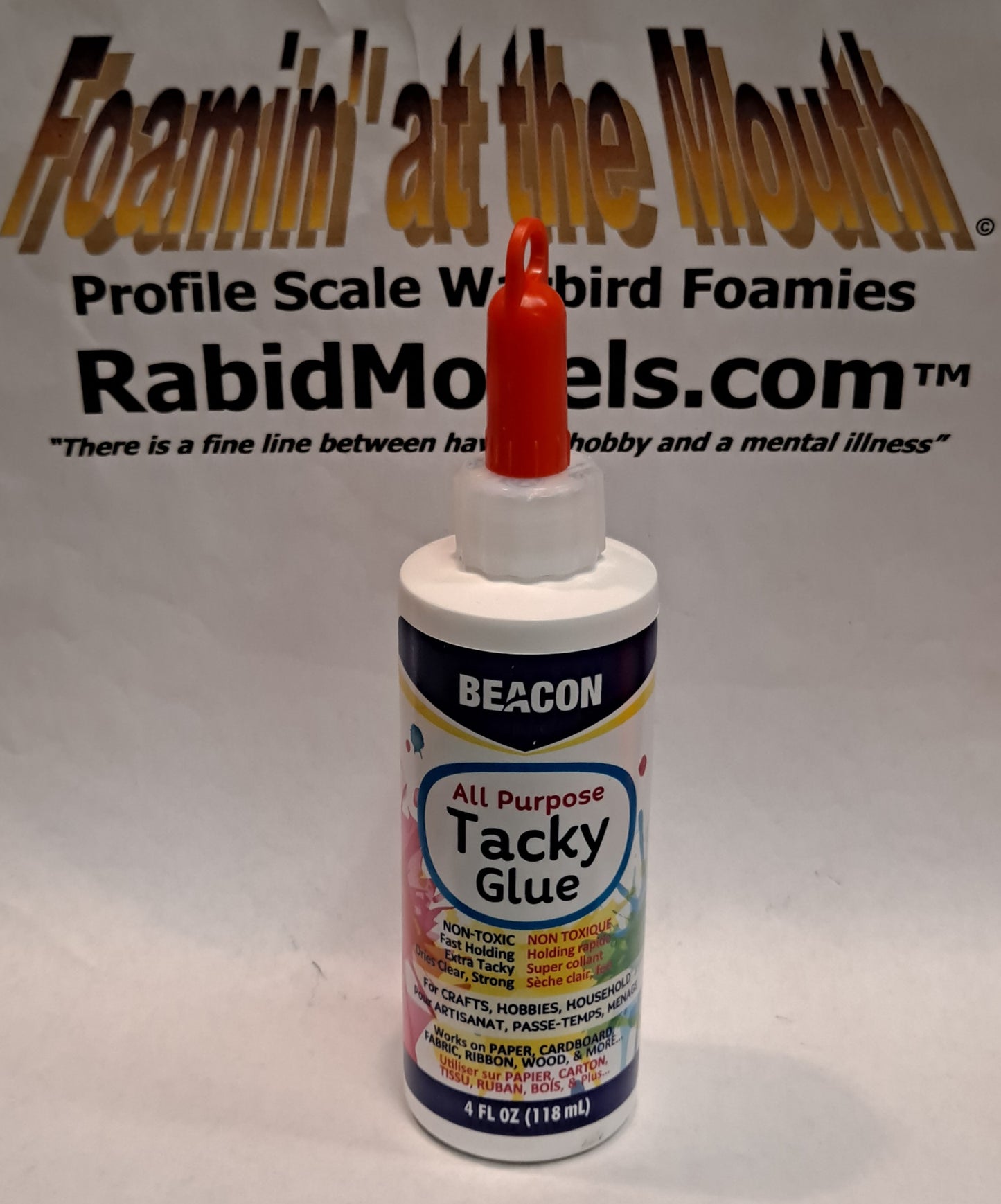 Beacon's Tacky Glue is a water-based PVA (Poly Vinyl Acetate) adhesive which looks and handles like regular white glue. It sets fast, dries clear, and can be cleaned up with water. Its completely safe on foam and its non-toxic. And its inexpensive!