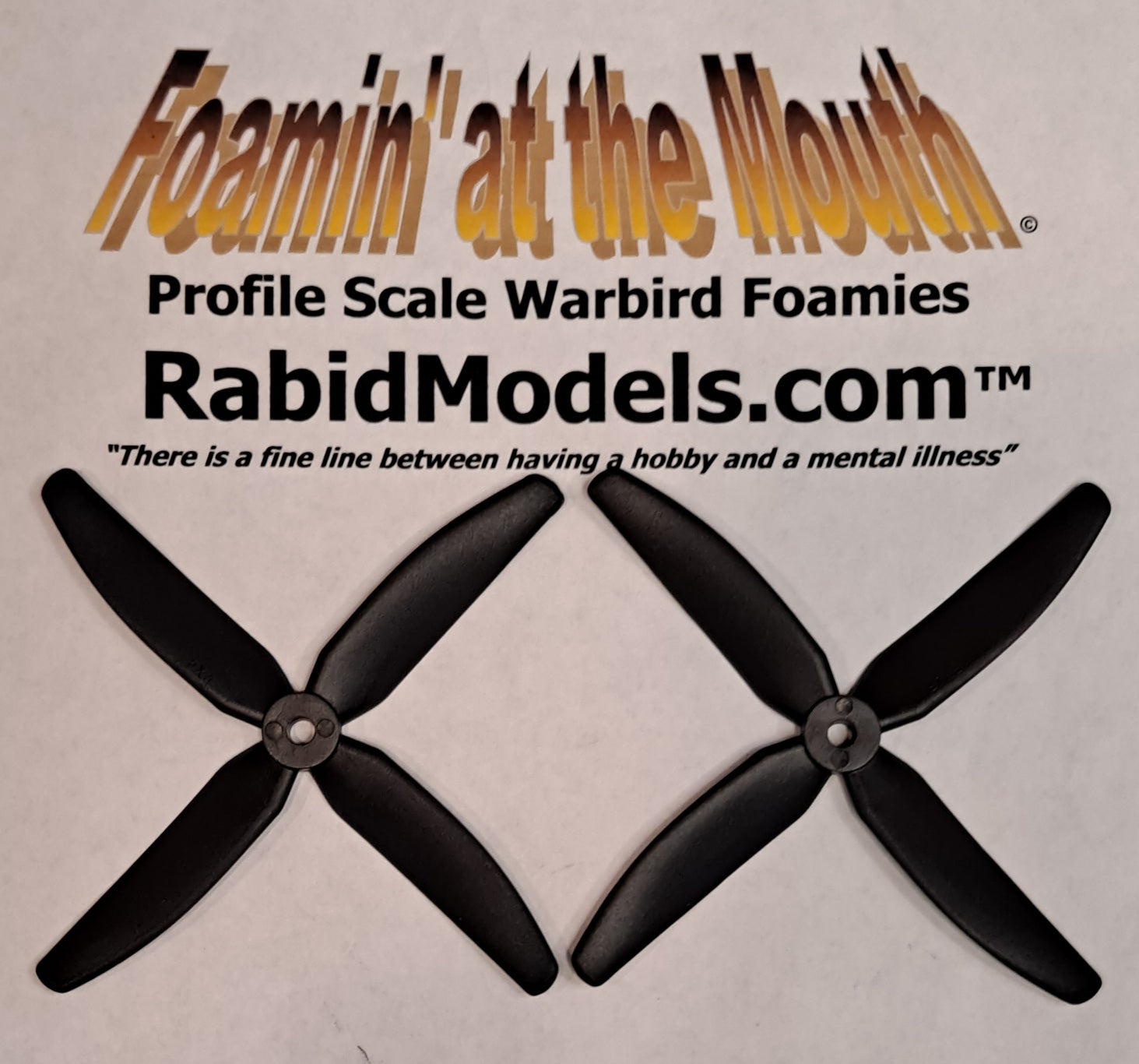 This is a set of two 5" diameter 4-bladed black plastic propellers - one standard rotation and one reverse rotation. This propeller is suitable for use with our 10gm motor, and most of our smaller planes. ONLY for electric motors.