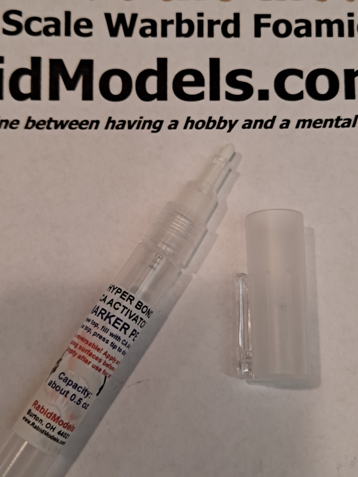 This is an EMPTY refillable "highlighter" ink marker. Fill it with CA Activator and apply the activator precisely to one side of the part BEFORE applying CA Glue to the other side - and then press the two parts together. No mess and it only applies where you put it. Its super easy to use - press the tip firmly to a surface to prime the marker with activator and then apply... and press again when you need more. The pen holds about 0.5oz of liquid activator. When done, pour the activator back into the bottle. Do not store activator in this marker because it will quickly evaporate and empty itself within 2 weeks.