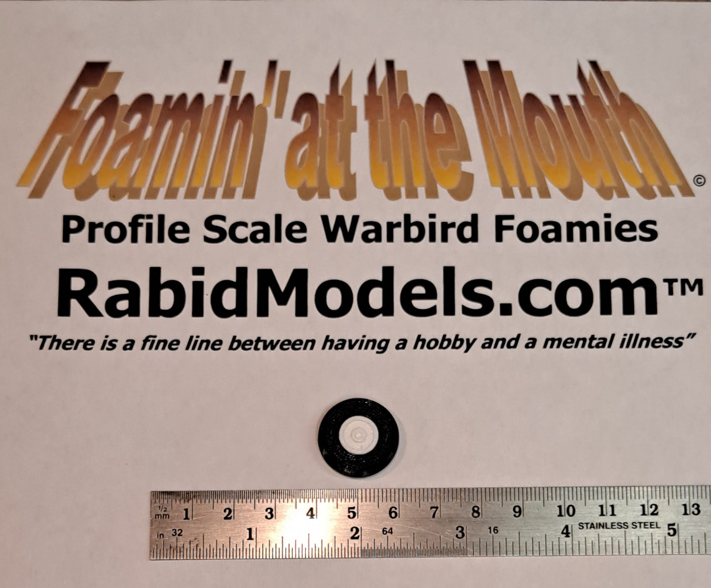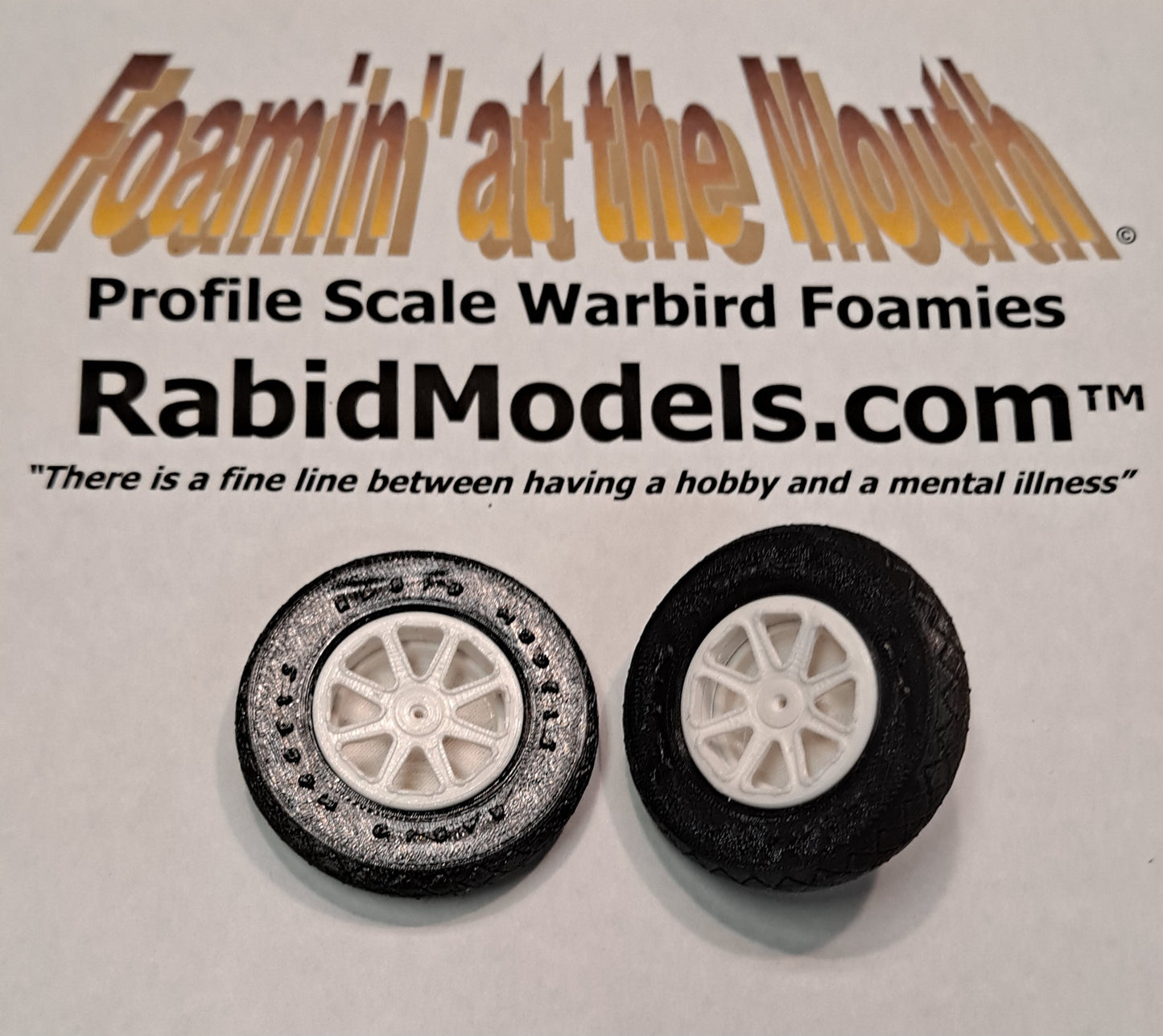 - Two wheel-hub sets (half spoked and half flat), 2 decorative strut covers, 2 plastic wheel collars (retainers). White Color. PLUS - two black diamond-tread TPU tires, these are 50x11.3mm (about 2" x 1/2") and weigh 5 gms each, and the tailwheel. The main wheel hubs weigh 4 gms/set. (Tire & hubs together = 9gms). The tailwheel=1gm.