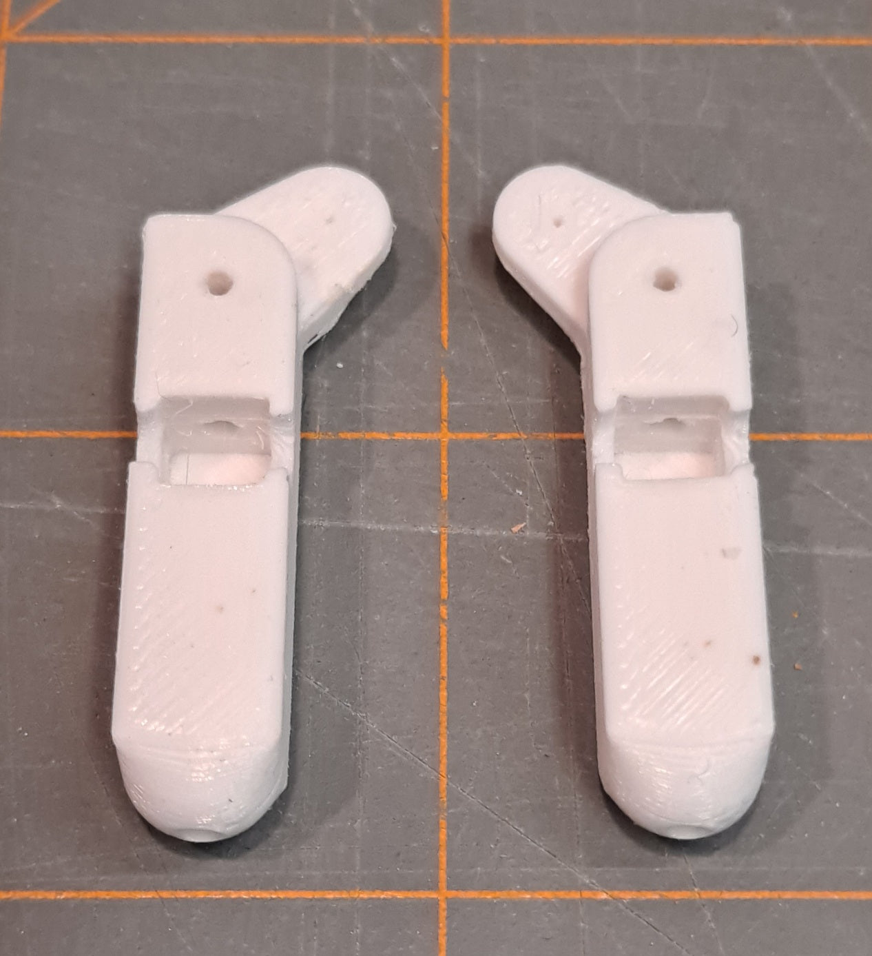 - 2 sets servo mounting tabs (4pcs), 2 sets hinge part H1 (4pcs), 1 set hinge part H2 (2pcs), 1 set hinge part H3 (2pcs), 2 pcs control horns part "CWH". Blue Color. The folding wing requires various pushrods (not included) and 2 x 9gm metal-gear servos (9gm MG servos available HERE). The folding wing is designed to incorporate Rabid Models' custom-designed rotating mechanical micro-retracts (see next).