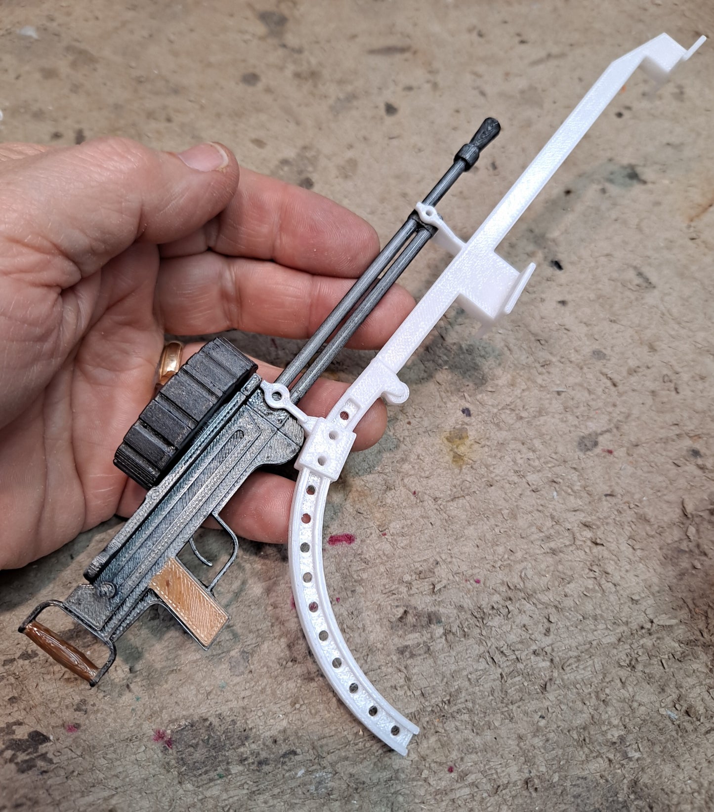 The Lewis Gun Kit has 10 pieces, made from 3D-Printed White PETG. There are 5 parts in two halves which must be glued together and assembled.