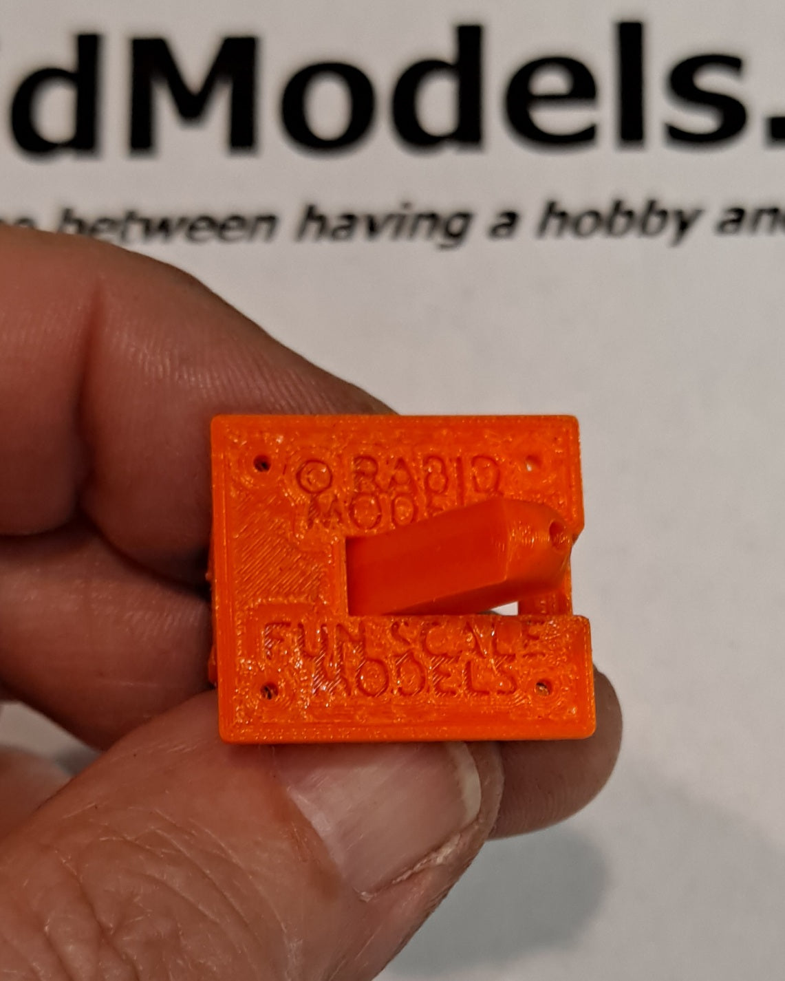 "Version 1" (V1) is the smallest at 18x20x12mm and 1.7gms. The trunnion has a very small tab for the pushrod, which is delicate. This unit is meant for very small models, say 6-12oz flying weight. V1 is supplied with an extra trunnion since its easy to break the tab. On a small model you could operate this with our small 2gm servo. V1 is printed in orange.