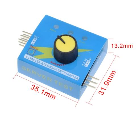 Use this small & handy device to test your servos - center them up before installing in your RC airplane, car, helicopter, or boat. Plug your 1S or 2S Lipo Battery into one side, and you can plug one, two, or three RC servos into the other side. Use the knob to operate the servo in each direction, or press a button and it will cycle automatically.